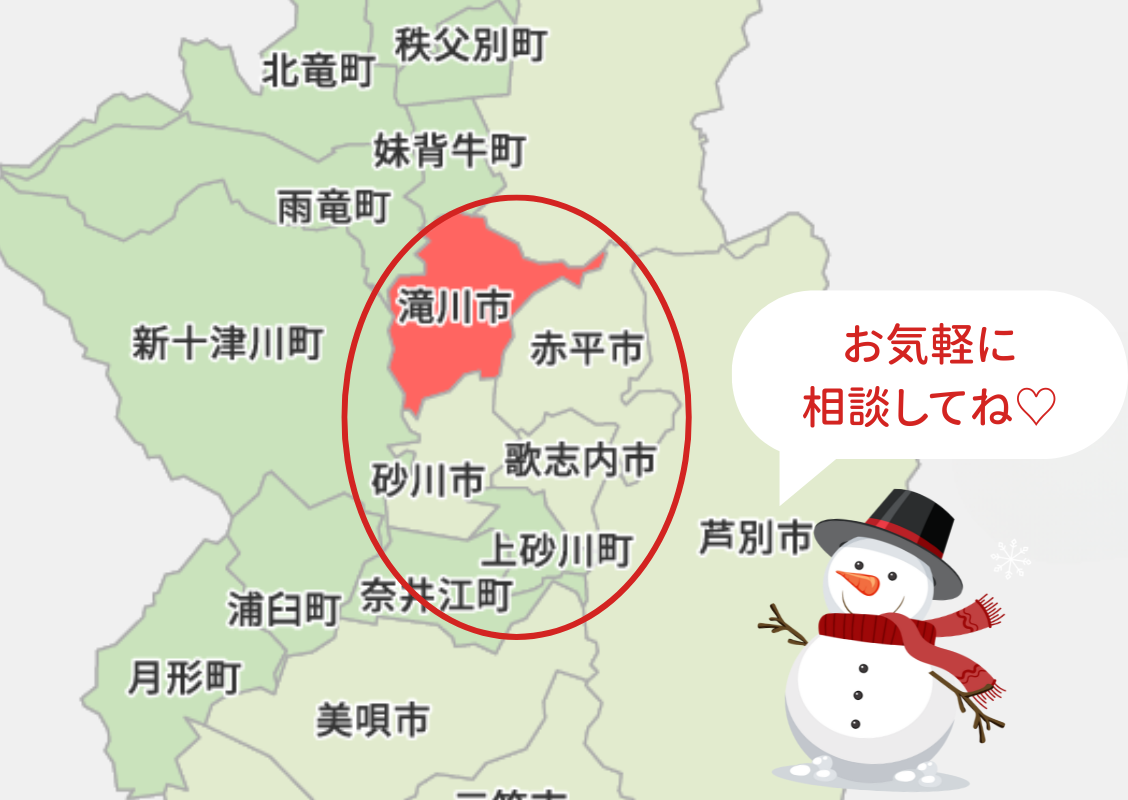 主に滝川市および近郊地域に対応しております。(赤丸の範囲の地域が目安です)